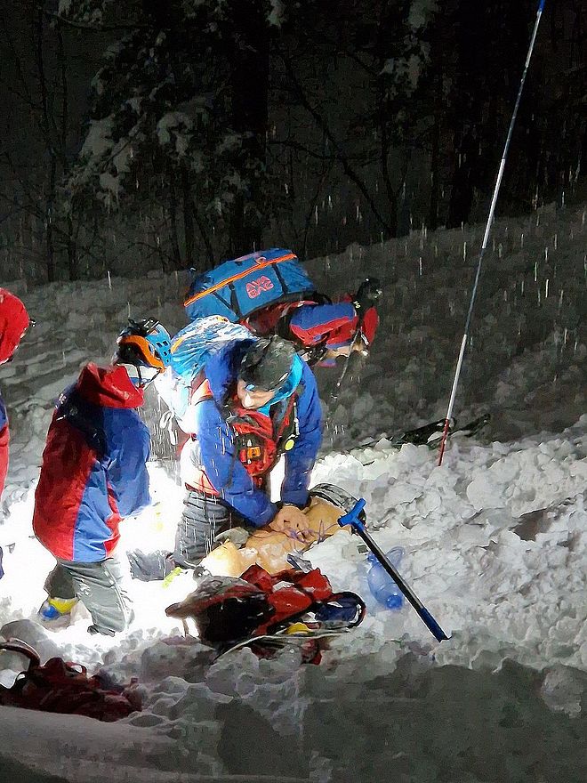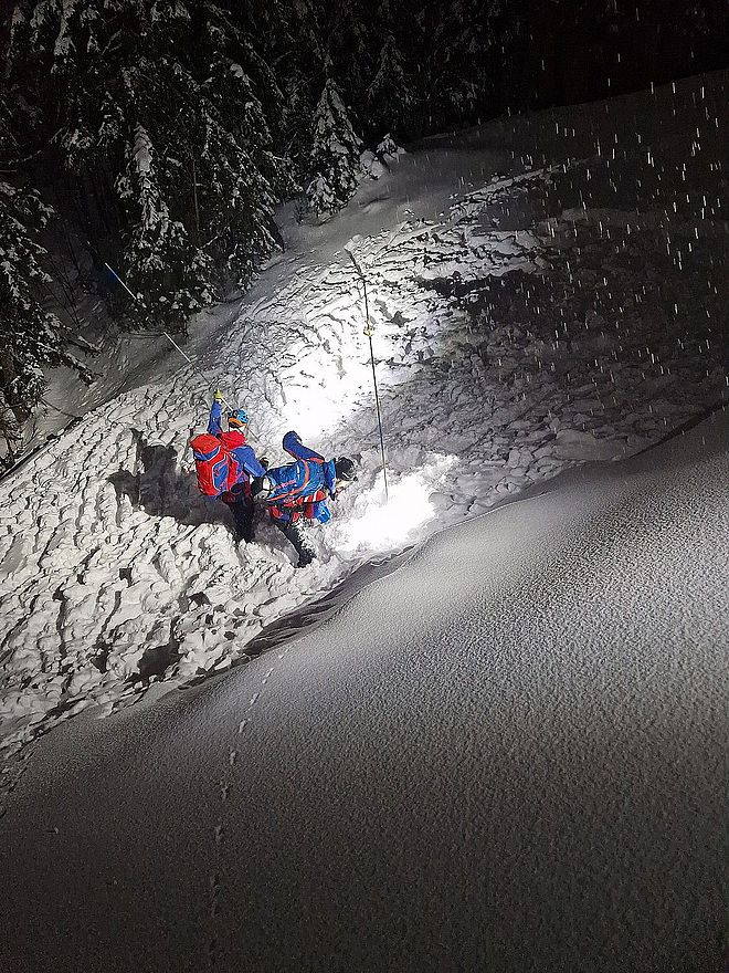 BISCHOFSWIESEN – Einsatzkräfte der Reichenhaller Bergwacht haben bei einer Nacht-Übung im unteren Abschnitt der Waldabfahrt am Götschenkopf im südöstlichen Lattengebirge die Rettung von zwei Verschütteten nach einem Lawinenabgang abseits der Piste des Wintersportgebiets realitätsnah geübt. Die ehrenamtlichen Einsatzkräfte mussten mit Tourenskiern zur angenommenen Einsatzstelle aufsteigen und auch die gesamte Ausrüstung zu Fuß transportieren, da aufgrund der Dunkelheit und des starken Schneefalls kein Heli fliegen konnte und gelände- und schneebedingt auch kein Raupenfahrzeug den Lawinenkegel erreichen konnte. Mit der persönlichen Notfallausrüstung (Verschütteten-Suchgerät, Sonde, Schaufel) orteten und befreiten die Bergretter dann einen über einen halben Meter tief total Verschütteten und begannen mit Wiederbelebungsversuchen; weitere Einsatzkräfte kümmerten sich um einen Teilverschütteten, der sich mit einer Fußverletzung zwar selbst befreien konnte, aber nicht mehr ohne fremde Hilfe nur noch liegend im Akja ins Tal kam.